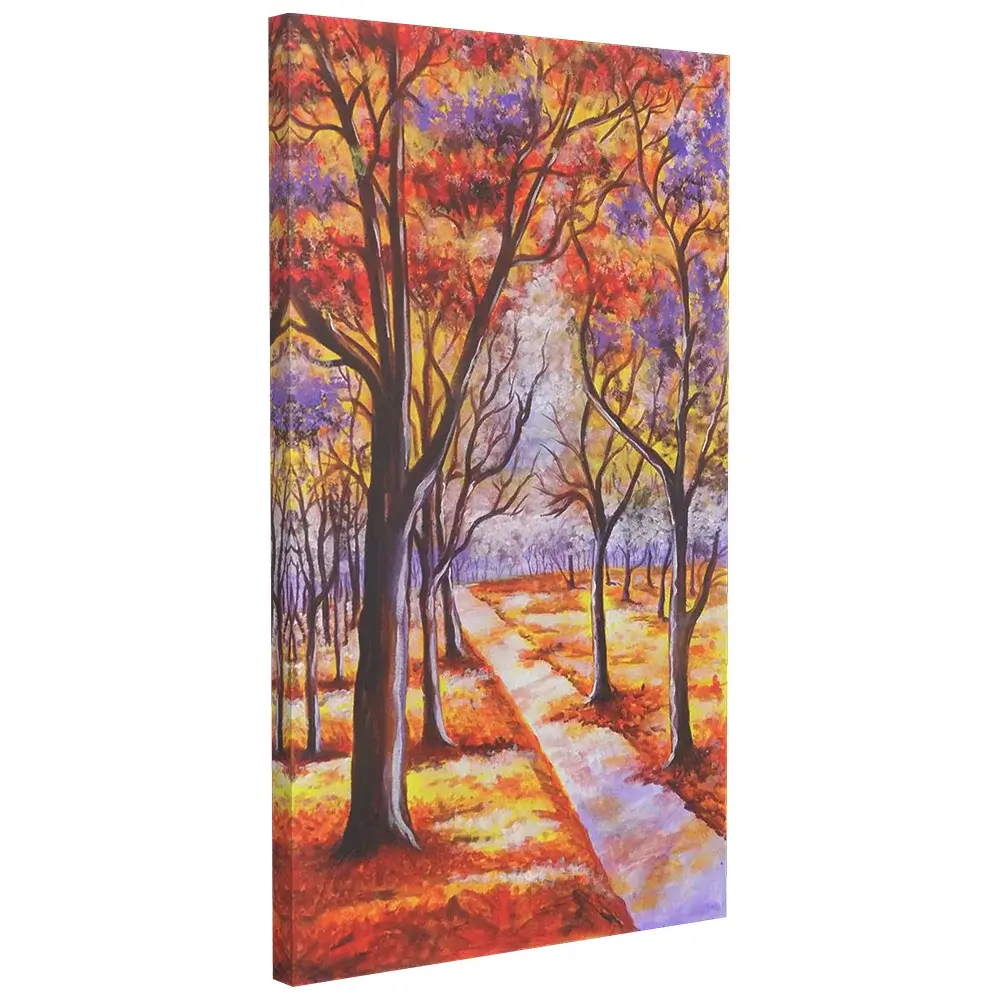 In addition, the color palette brings emotional depth to the scene. Rich reds, warm yellows, and soft purples blend harmoniously, reflecting the changing energy of autumn. Lighter tones along the pathway introduce contrast, helping the composition breathe. As a result, the artwork feels radiant and calm at the same time.