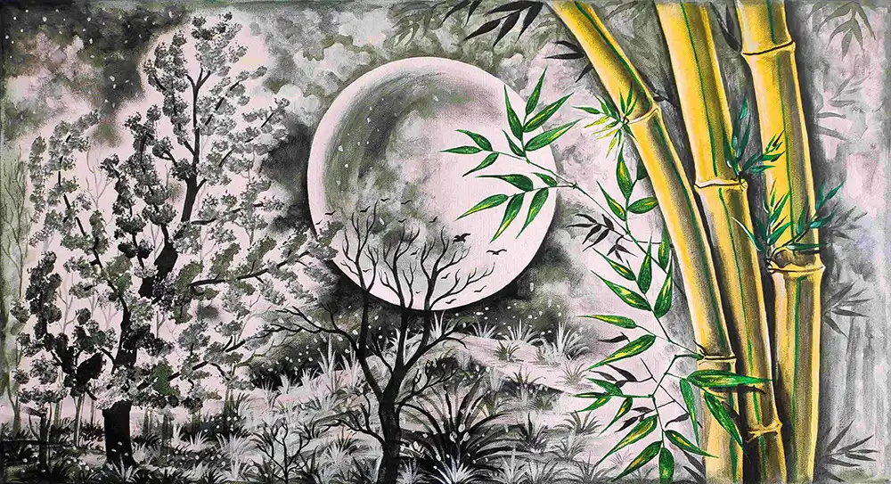 Bamboo and moon landscape acrylic painting