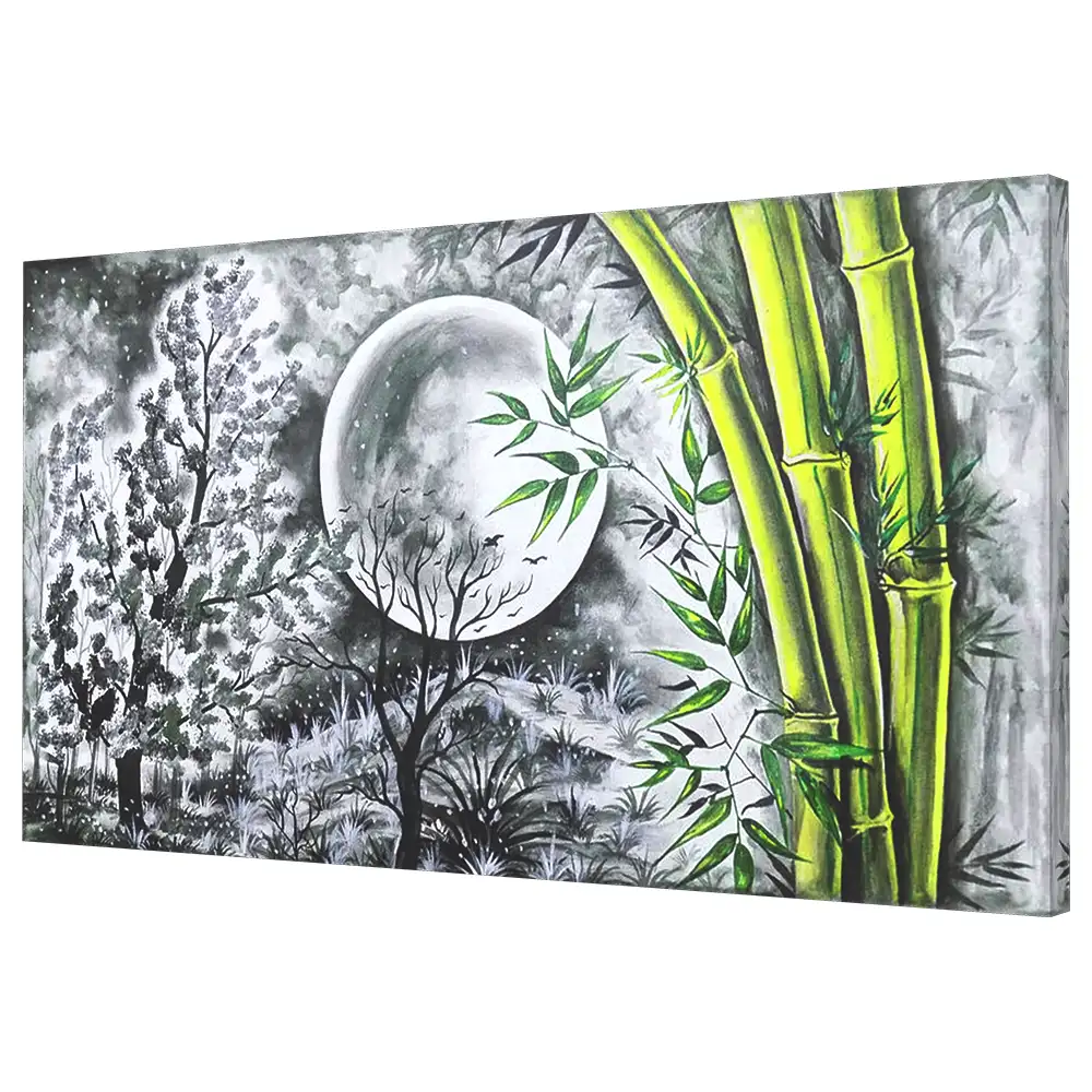 Acrylic paint ensures durability and lasting tonal quality. Over time, the artwork retains its softness and contrast. Ultimately, this bamboo and moon landscape painting offers a visual pause—bringing harmony, quiet strength, and contemplative beauty into your space.