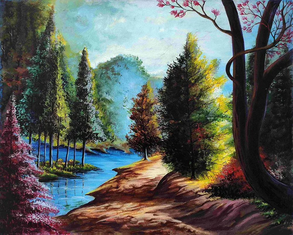 This hand-painted nature scenery landscape painting celebrates the gentle rhythm of the natural world through color, light, and perspective. A calm water body flows alongside a winding earthy path, while layers of trees rise gracefully on either side. Together, these elements create a scene that feels inviting, grounded, and deeply reflective.