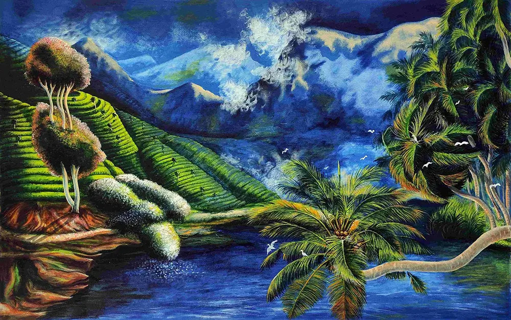 From the beginning, the artwork communicates balance and abundance. The composition moves naturally from land to water, allowing the eye to travel smoothly across the scene. Meanwhile, the curved forms of the hills and palms introduce rhythm and continuity. Because of this fluid arrangement, the painting feels peaceful and immersive.
