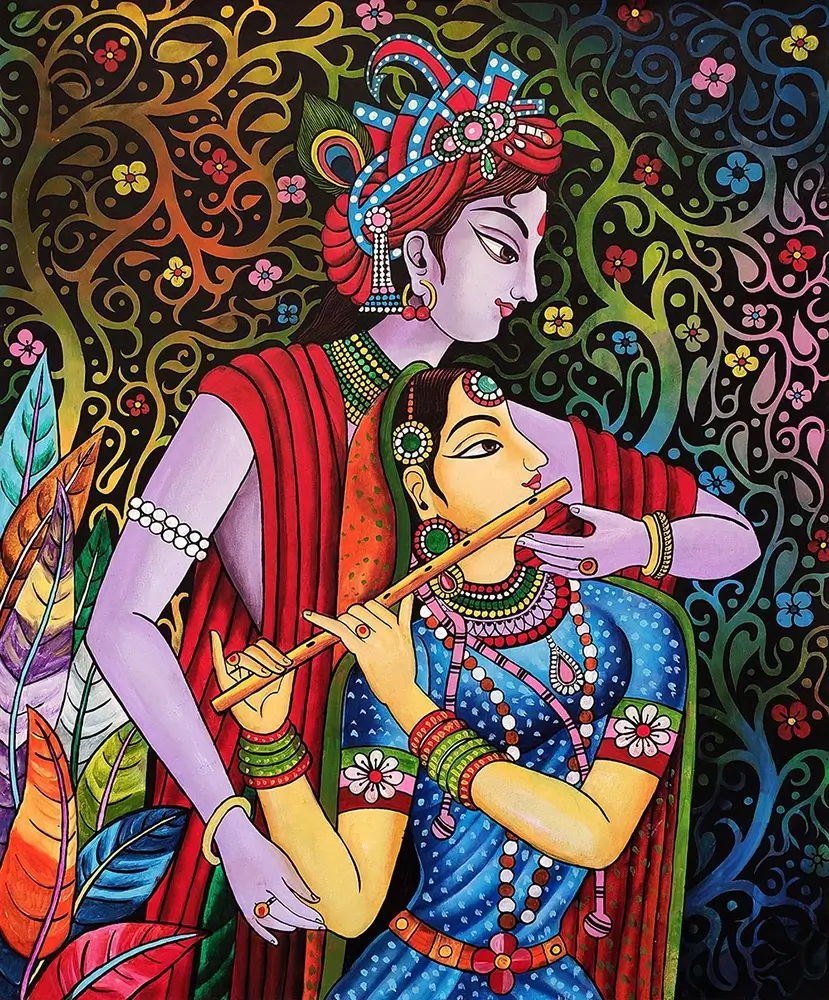 The artist uses soft blues, warm golds, and deep reds to create balance. Krishna’s cool tones contrast beautifully with Radha’s warmth. Their garments feature precise patterns inspired by temple murals.