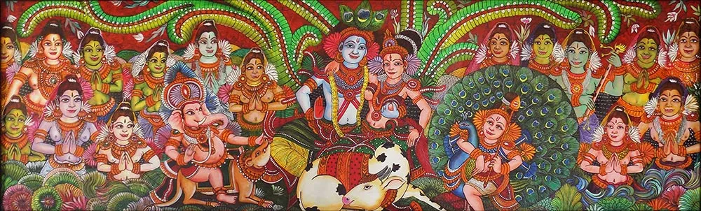 The color palette remains faithful to classical Kerala mural traditions. Warm ochres, deep greens, and glowing reds dominate the background. Accents of blue, white, and gold highlight divine forms and ornaments. As a result, the mural feels vibrant yet composed.