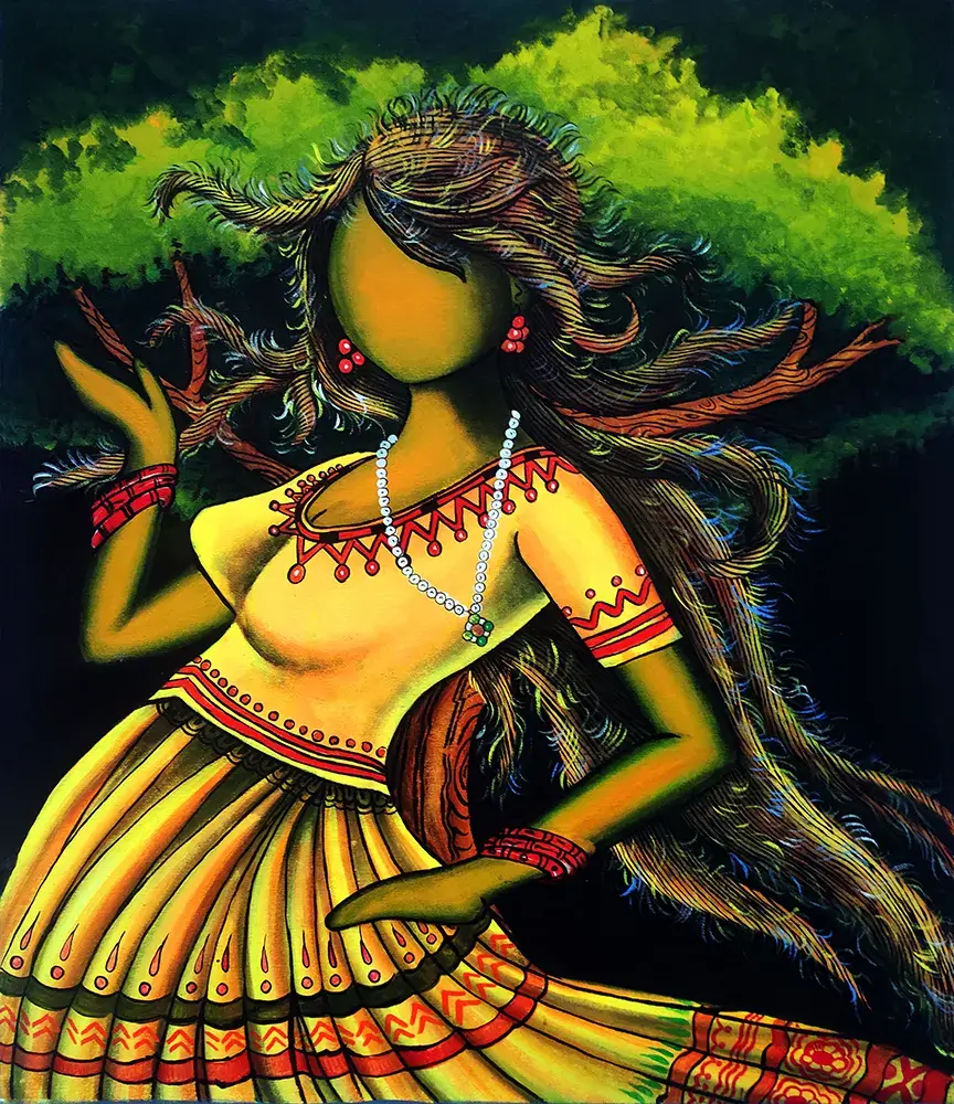 This mango girl dancing painting celebrates the joyful bond between nature and feminine spirit. The faceless dancer twirls gracefully while her flowing hair merges with the lush canopy of her parent mango tree. Instead of realism, the artwork expresses emotion and symbolism through vibrant Indian folk styling. As a result, the composition feels lively, cultural, and deeply meaningful.