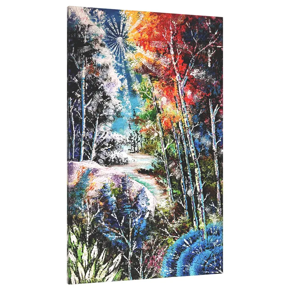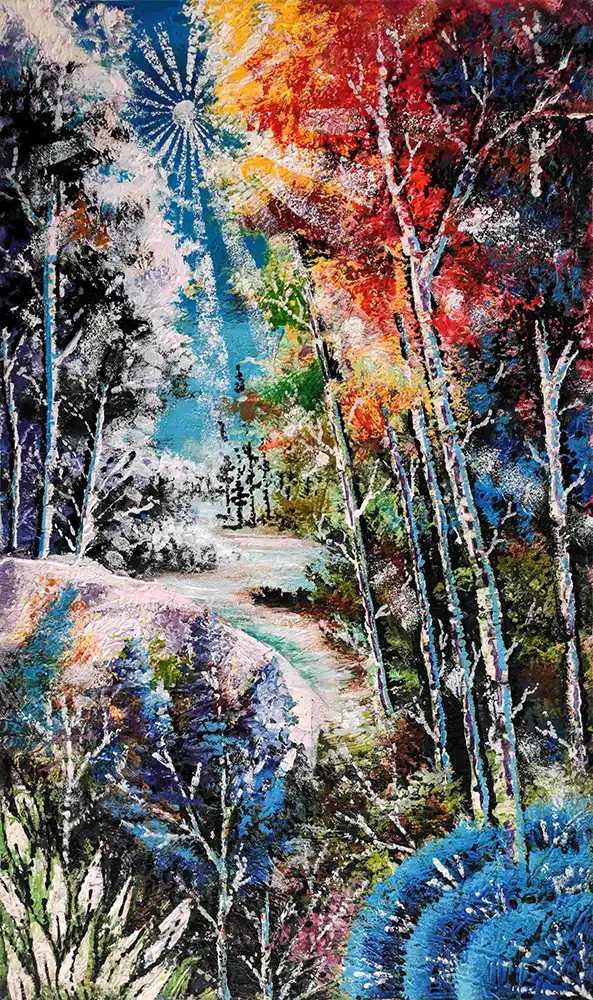 At first glance, texture takes center stage. The knife technique builds dimension through bold paint application, allowing colors to interact physically on the surface. As light appears to break through the trees, the layered strokes amplify brightness and contrast. Because of this approach, the painting feels dynamic and alive.