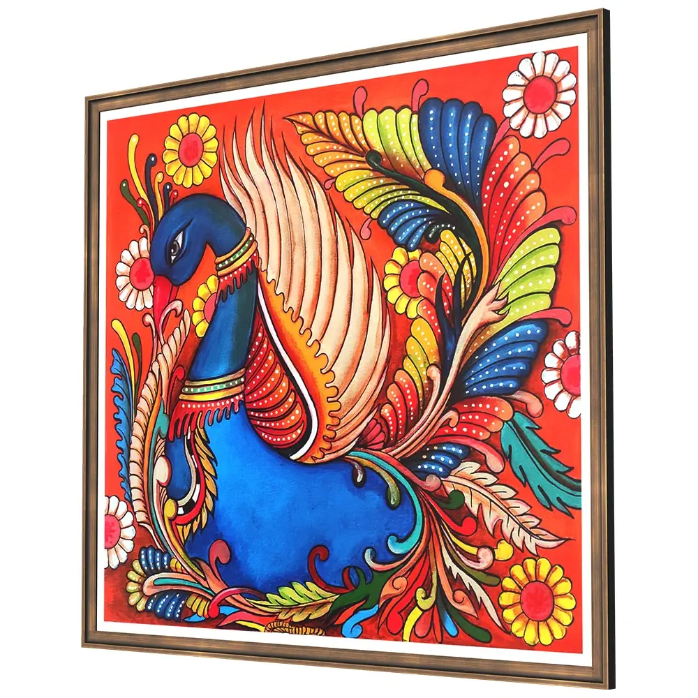 This Peacock Kerala mural painting captures the timeless charm of one of nature’s most celebrated birds through a distinctly traditional artistic language. Rendered in classic Kerala mural style, the composition blends symbolism, ornamentation, and rhythmic movement into a visually uplifting artwork.