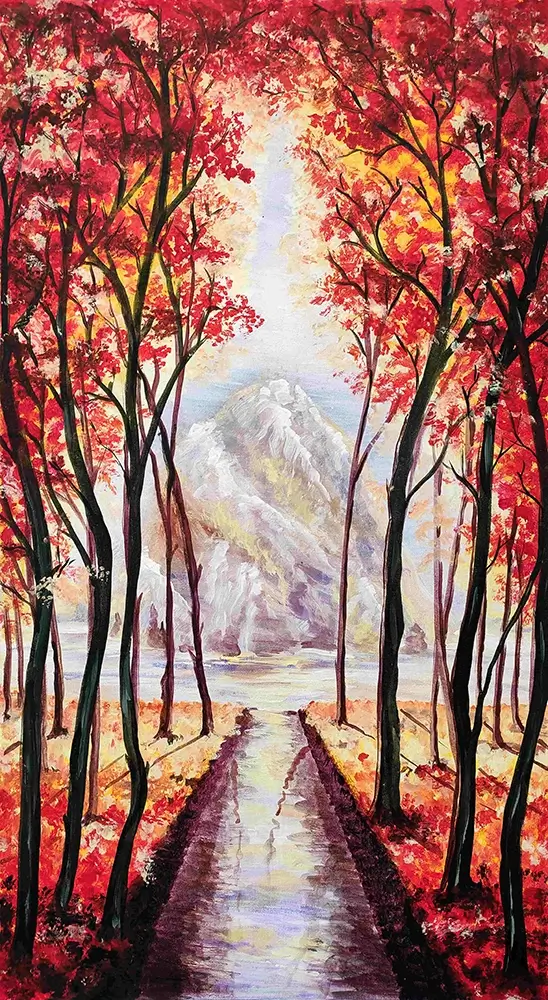 This red trees lakeside landscape acrylic painting presents a scene of balance, reflection, and gentle movement. Tall trees line both sides of a narrow water path, their vivid red and golden leaves forming a natural frame. At the center, calm water stretches toward distant mountains, creating a sense of direction and quiet anticipation.